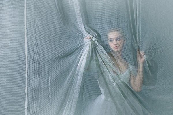 Para darle misterio y delicadeza a su obra fotográfica emplea el uso de telas.