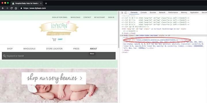 Para que nos hagamos una idea, si visitamos una de las webs identificadas por Netlab360 –en este caso, una tienda de venta de productos para bebes- y echamos un vistazo a su código, vemos que efectivamente, ejecuta JavaScript procedente de magento-analytics[.]com, tal y como observamos en el pantallazo inferior.
