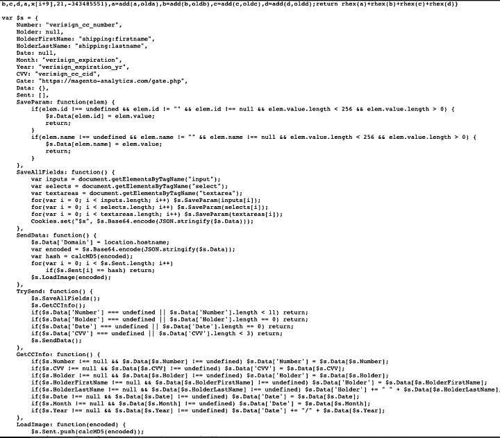 Si echamos un vistazo rápido al JavaScript vemos que incluye trozos de código y variables con nombres como verisign_cc_number, shipping:firstname, shipping:lastname, verisign_expiration, verisign_expiration_yr, y verisign_cc_cid. Las funciones dan a entender que lo que aquí se realiza es una recolección de los datos de la tarjeta de pago del cliente, y las extrae de manera totalmente opaca para el usuario.