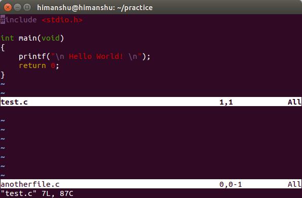 Observe que el comando divide la ventana Vim horizontalmente. En caso de que desee dividir la ventana verticalmente, puede hacerlo utilizando el comando vsplit. Una vez abiertos ambos archivos, copie el material de un archivo, pulse «Ctrl + w» para cambiar el control a otro archivo y pegue.