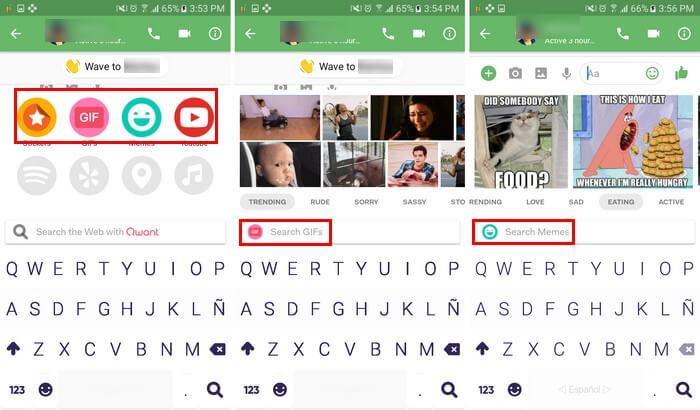 Si eres adicto a GIF y MEME, te puede gustar Fleksy . Toque el icono Fleksy en la parte superior izquierda del teclado para acceder a pegatinas, GIFs, MEMEs, YouTube y el navegador Qwant para buscar en la Web de forma privada.