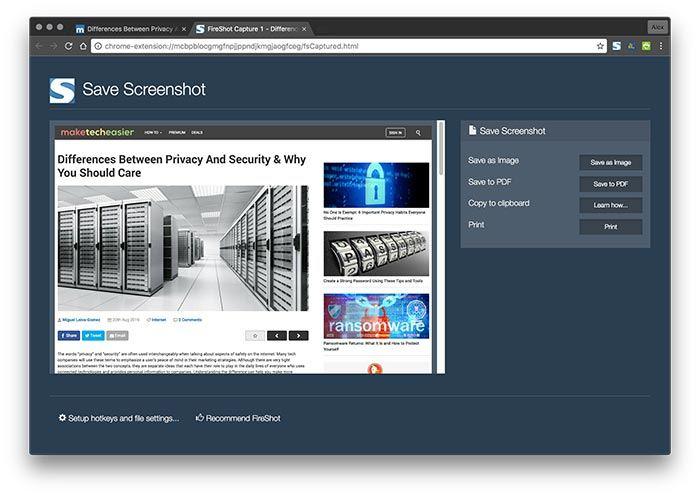 Si en realidad sólo necesitas más control sobre una captura de pantalla, Fireshot es una gran herramienta. Puede capturar capturas de pantalla de páginas web completas (incluso las que se desplazan infinitamente) y luego guardarlas rápidamente como JPG o PDF. Aunque ninguno de los textos en el PDF será seleccionable, sigue siendo una gran opción si realmente necesitas una herramienta de captura de pantalla mejorada.