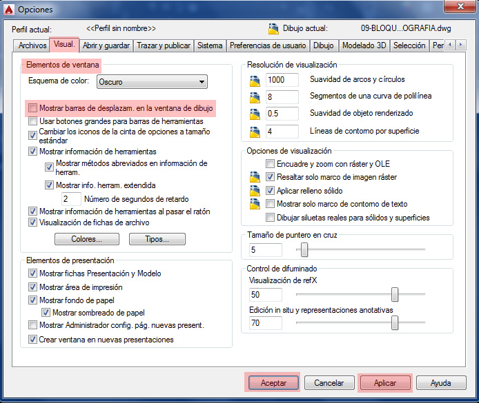 En la ventana de OPCIONES en la pestaña VISUAL en el apartado de ELEMENTOS DE VENTANA activamos la opción MOSTRAR BARRA DE DESPLAZAMIENTO EN LA VENTANA DE DIBUJO. Pulsamos APLICAR y ACEPTAR.