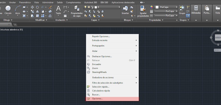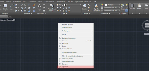 Para activar la barra de desplazamiento pulsamos con el botón derecho del ratón sobre la pantalla de Autocad y seleccionamos OPCIONES.
