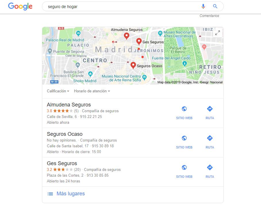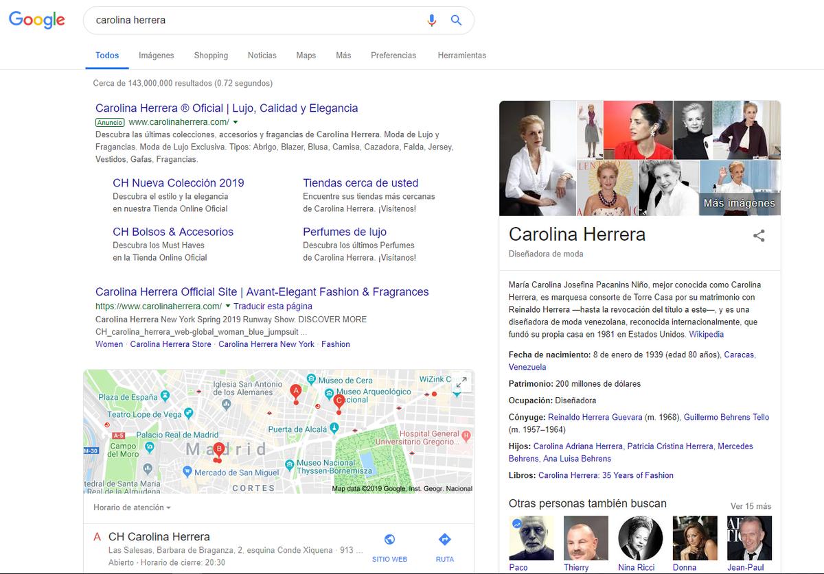 Resultados locales para búsquedas genéricas. Empezamos a ver resultados locales para búsquedas genéricas como “juegos de cartas” donde Google mostraba snippets locales de tiendas de juguetes u otros casos como este de Carolina Herrera, donde para la búsqueda de la keyword genérica de la marca nos pinta los resultados locales o incluso para keywords relacionadas con productos concretos como “seguro de hogar”