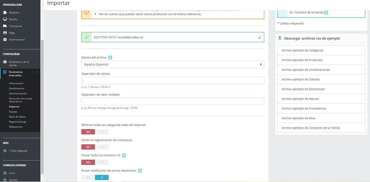 Disponemos de diferentes opciones para subir nuestros archivo, como eliminar los productos antes de subir nuestro archivo, utilizar la referencia del producto como clave, sogún nos convenga.