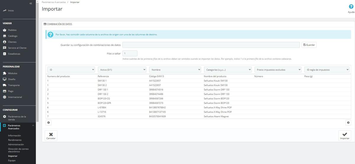 Tendremos que ir asociando cada columna de nuestro Excel con la que corresponda en PrestaShop, para eso solo tendremos que pinchar en el desplegable de cada columna y seleccionar a que corresponde cada columna.