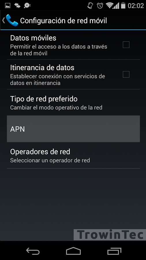 Hay una forma técnica de referirse a estos datos que es configurar el APN (Access Point name o nombre de punto de acceso) y para configurarlo solo tendréis que acceder en el menú, y seleccionar más ajustes, a continuación redes móviles y acto seguido en el botón menu y marcamos agregar nuevo para meter los siguientes datos: