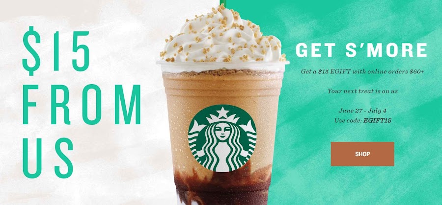 A partir de ahora hasta el 4 de julio, puedes obtener una tarjeta de regalo gratis de $ 15 en Starbucks con tu compra de $ 60 en línea en store.starbucks.com. Utilice el código "EGIFT15" en la caja para canjear esta oferta.