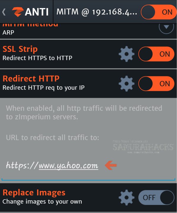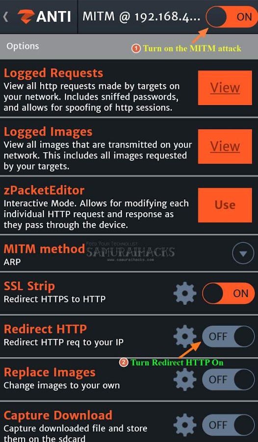 Ahora active el ataque MITM haciendo clic en el botón en la esquina superior derecha de la pantalla y luego encienda el "Redirigir HTTP" a continuación como se muestra en la imagen a continuación.