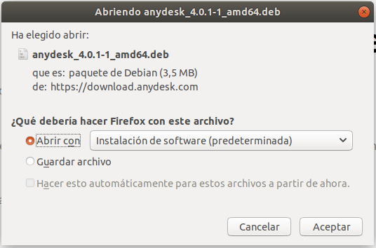 Nos descargará un fichero de unos 3,5 MB y seleccionaremos Abrir con: Instalación de software (predeterminada) y daremos a Aceptar.