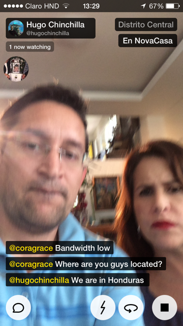 El enlace del livestream se publica en twitter junto al hashtag #Meerkat. En la parte izquierda de la pantalla puede observarse un cuadro de diálogo con el que se podrá mantener una conversación con todos los usuarios que se conecten a su evento.