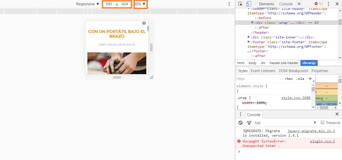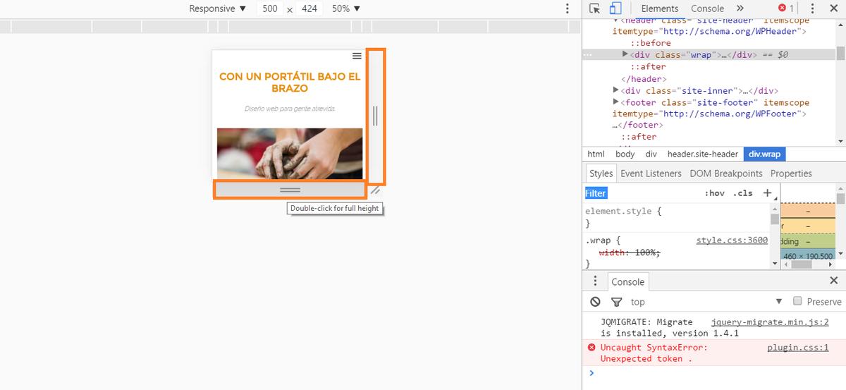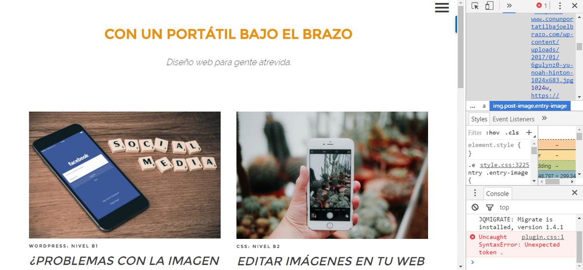Como puedes ver, la columna que nos aparece nada más abrir el inspector está dividida en tres secciones: la primera sección equivale al HTML de la página, donde aparece en azul el HTML del elemento sobre el que nos hemos situado al abrir el inspector, pero si subes y bajas podrás ver el HTML del resto de la página, algunas zonas de ese archivo te aparecerán así “<elemento>…</elemento>” eso se debe a que esas etiquetas tienen anidadas dentro muchas otras haciendo referencia a sus respectivos elementos, por lo que el inspector para no mostrarte todas esas líneas de código las comprime y con dar a los tres puntos ya puedes comenzar a sacar matriuscas de la caja; la segunda sección equivale al CSS de ÚNICAMENTE el elemento sobre el que te has situado para abrir el inspector, además también te muestra los estilos que ha heredado de otros elementos. Para mi esta es la sección más útil porque puedes probar a añadir nuevos estilos, clicando en cualquier parte de la sección CSS; o quitarlos, situándote sobre el estilo aparecerá un rectángulo a su izquierda, quitando el tic que tiene el rectángulo eliminarás el estilo; y ver como queda el resultado. Los cambios que hagas en cuanto actualices la página desaparecen. Por último, la tercera sección, equivale a los errores que puede tener tu plantilla, normalmente suele ser que pones enlaces algún archivo (css o js) que no existe en tu directorio, también te avisan de los errores de JavaScript y jQuery…