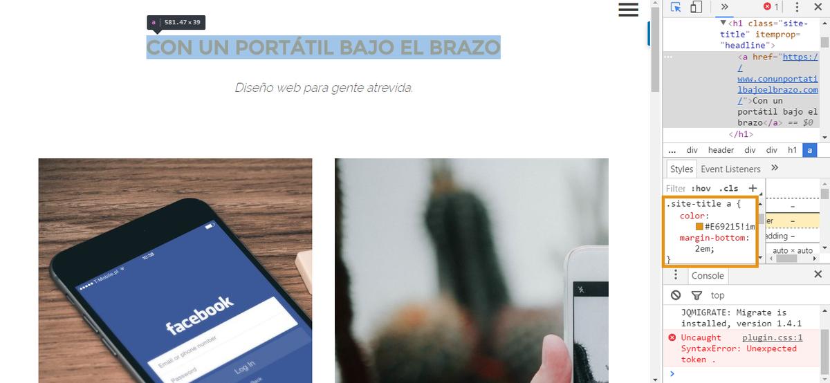 En la parte de arriba como puedes ver la captura hay varias opciones, la que nos interesa es la primera, la de la flechita, por lo que clicamos en ella. E imaginad que quiero saber qué color es el que estoy utilizando en la cabecera (“Con un portátil bajo el brazo”) de la web, pues una vez dada la opción que he mencionado anteriormente, me acercó al elemento y clico sobre él una vez.