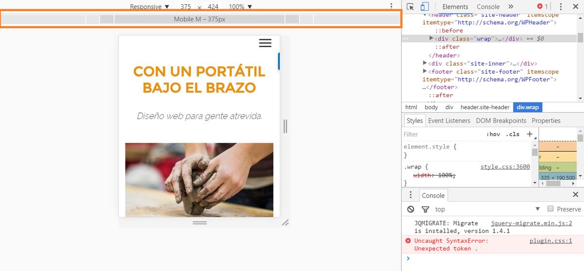Sobre la pantallita con nuestra web aparecen varias opciones. La primera sobre la pantallita es una barra donde puedes ir marcando el tamaño y ver como queda en un móvil S, un M…
