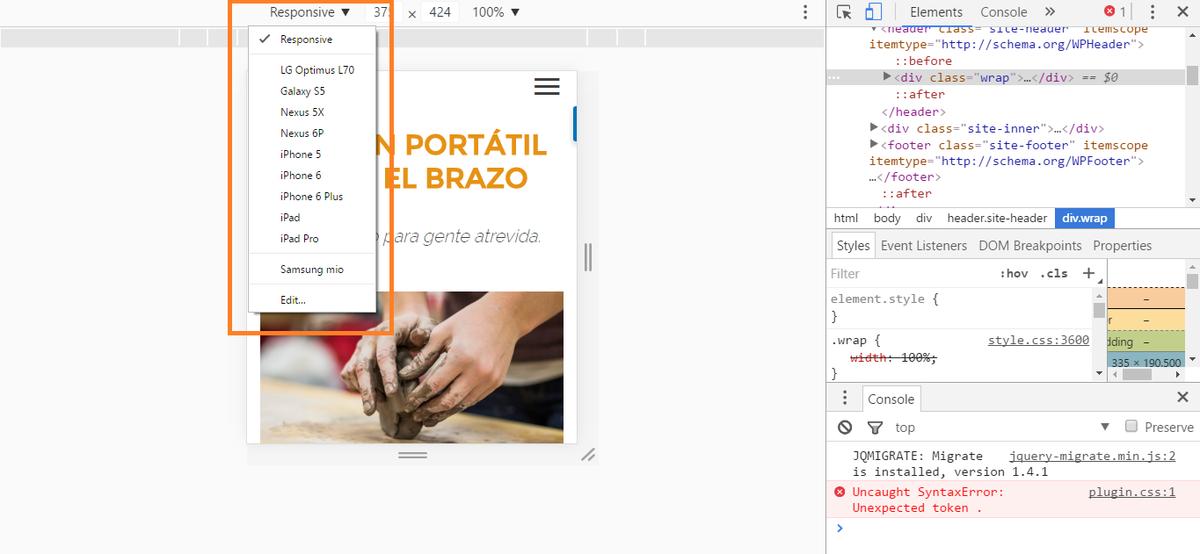 La última cosa básica que debes saber sobre la herramienta: Gracias a esta herramienta también puedes saber si tu web es responsive y como se ve en diferentes dispositivos, para ello volvemos a arriba del todo, donde antes dimos al símbolo de la flechita.
