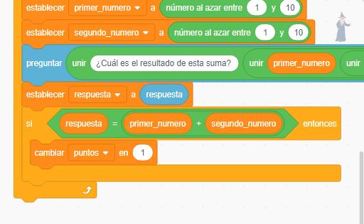 Lo que hicimos en este último punto es verificar que el número ingresado por el usuario sea igual a la suma de los dos números dados.Si la respuesta es correcta sumamos 1 punto a la variable puntos.