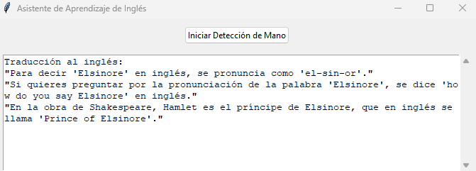 La aplicación comienza inicializando la interfaz gráfica de usuario (GUI) con tkinter, creando un botón para iniciar la detección de manos y un área de texto para mostrar traducciones y mensajes al usuario.pythonCopy codeclass EnglishLearningAssistant: def __init__(self, master): ...