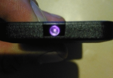 Esta "luz" no se puede ver a simple viste ya que el ojo humano no es capaz de captar esa longitud de onda, aun así siempre podemos comprobar si el infrarrojo de nuestro control remoto funciona mediante cualquier cámara de teléfono móvil. Solo tenemos que apuntar el emisor del control remoto al objetivo de la cámara y pulsar cualquier botón, el led IR debe encenderse en un color violaceo como en la imagen: