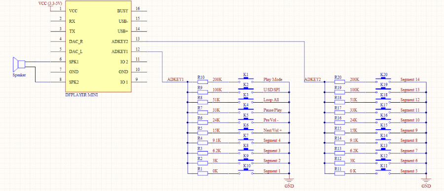 Con este diagrama podemos controlar del DFPLAYER MINI con apenas 4 pulsadores: