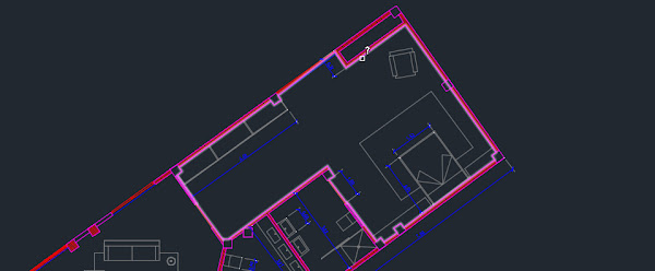 Para empezar tendrás que convertir o dibujar el contorno de la zona a medir en una polilínea, en nuestro caso hemos dibujado una polilínea del contorno de cada estancia de una planta del apartamento que vemos en la imagen inferior. Mediremos el área del dormitorio.