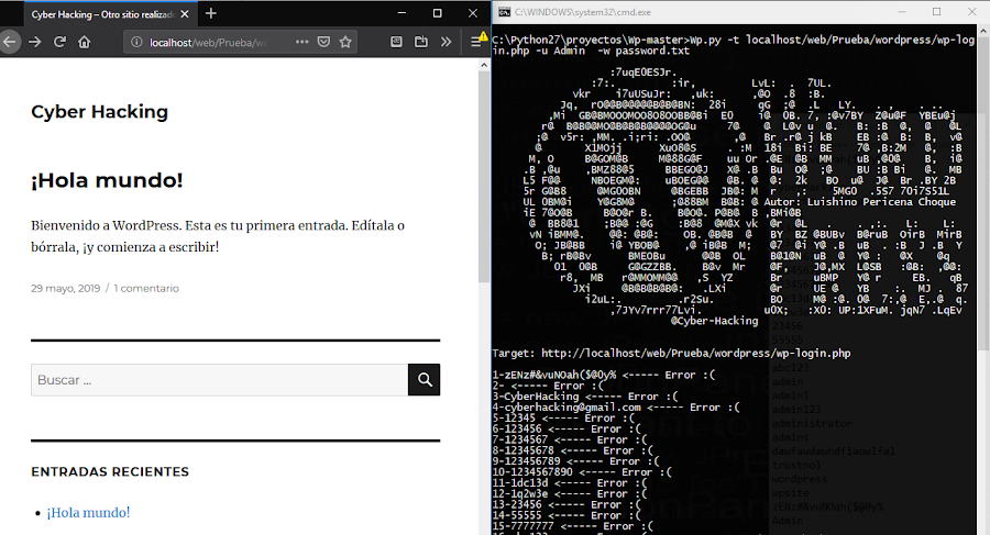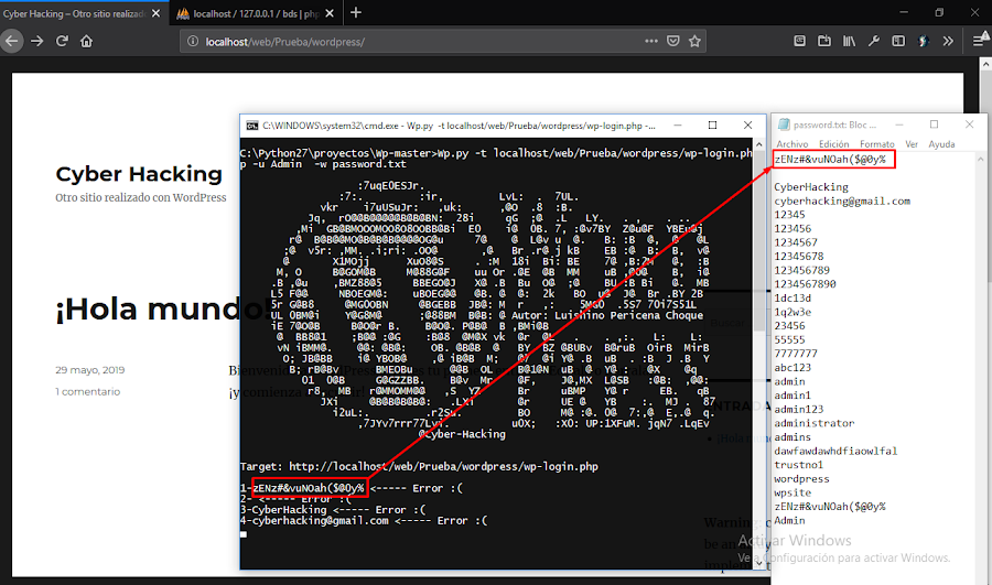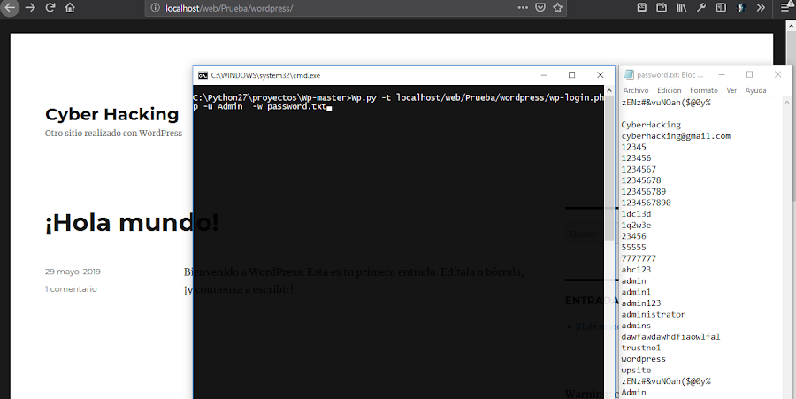 Luego ingresamos los comandos y la url de la web de wordpress.Wp.py -t localhost/web/Prueba/wordpress/wp-login.php -u Admin -w password.txt