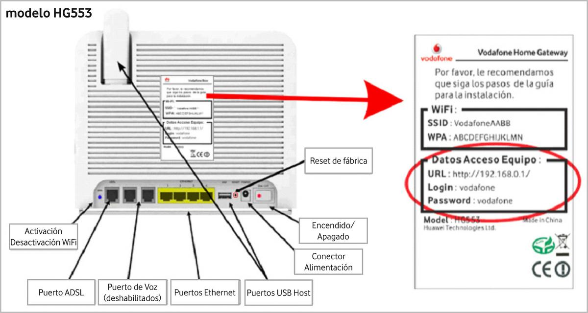 En el router tienes que localizar 2 cosas importantes, como estas conectando con cable, logicamente tienes que buscar donde conectar el cable. Aqui abajo os pongo uno de la Compañia Vodafone que me parece que nos sirve para ambas cosas que necesitamos saber, en la mayoria son similares y se localizan en el mismo lugar, pueden estar en la parte trasera o en un lado los conectores y la etiqueta por detrás.