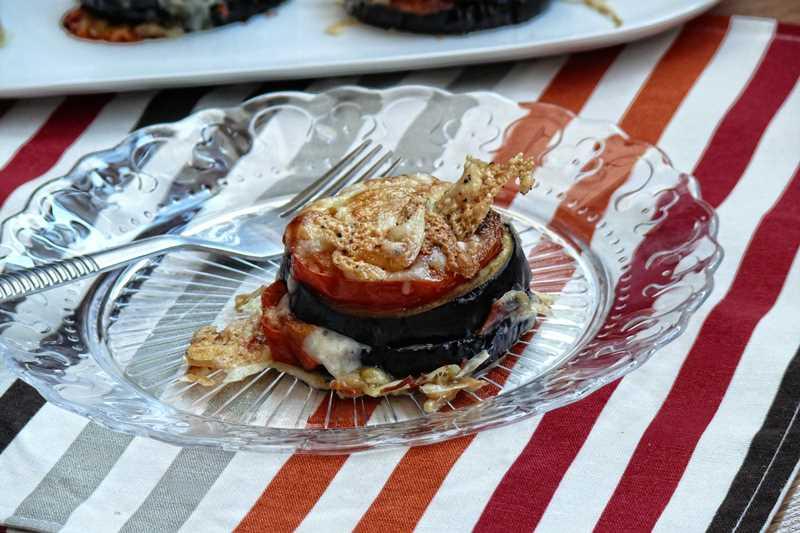 Cuando los tomates lleven 15 minutos, montamos las berenjenas, colocando una rodaja de berenjena, queso, tomate, otra rodaja de berenjena, queso y tomate y terminamos espolvoreando con más queso o rompiendo un huevo. Repetimos hasta que montemos todos los milhojas.