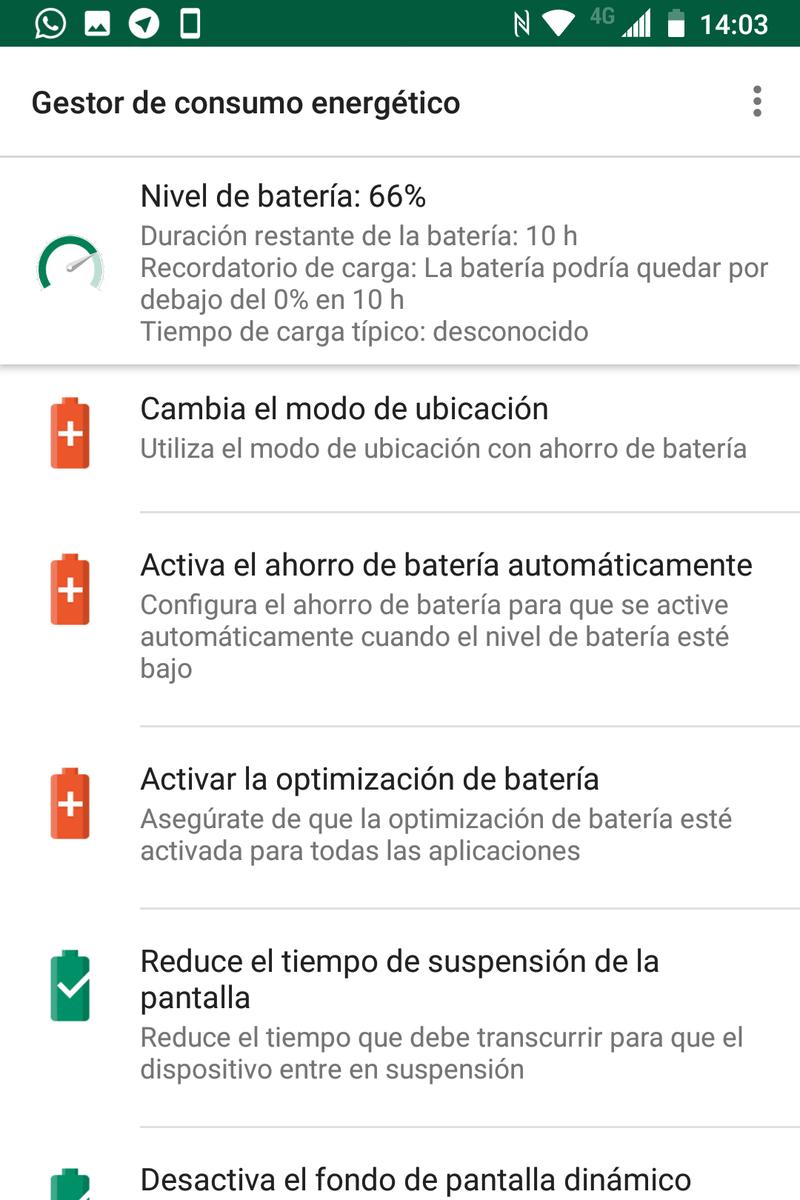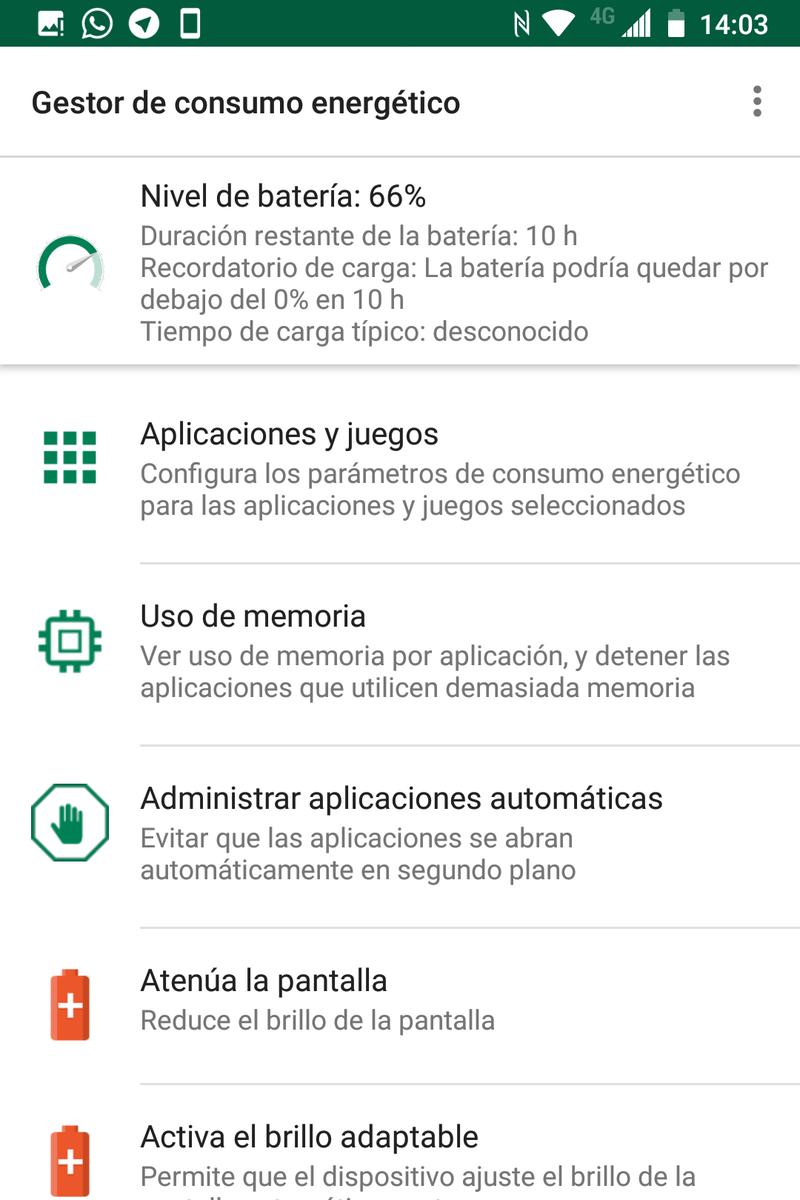 Gestor de consumo energético, nos dará recomendaciones de cuando cargar la batería aprendiendo del uso que hacemos, aportará información de qué aplicación gasta más, entre otros ajustes de consumo.