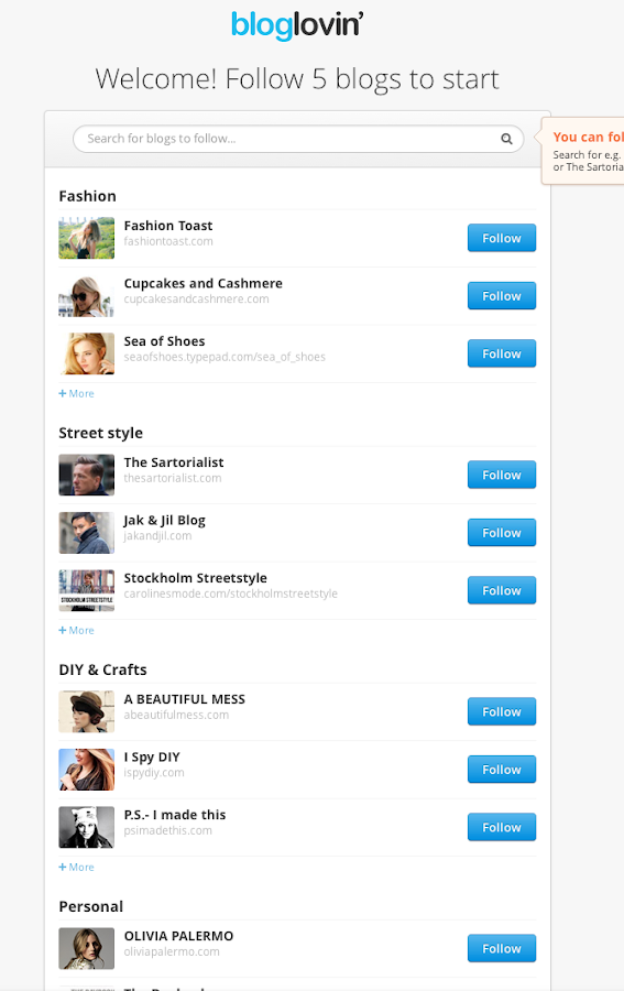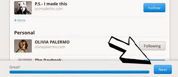 Si eliges abrir tu cuenta con tu correo, el siguiente paso será proveer tus datos y luego recibirás confirmación en la bandeja de tu correo con un link de bienvenida...luego de la parte aburrida de registro y confirmación en la pagina principal de bloglovin vas a encontrar algo parecido a la fotito siguiente... donde te sugieren seguir 5 blogs, este paso lo puedes tomar o simplemente dejar...NEXT!