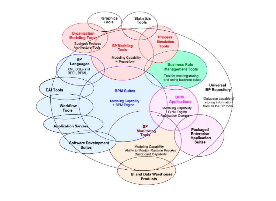 BPMS (Business Process Management Software, o también llamados BMS/BPM suite) o los software BPA (Business Process Analysis) usados en BPMN que además incorporan otras capacidades como la simulación de procesos.