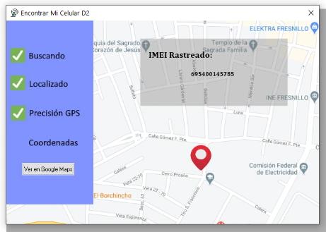 Cuando se ingresa el IMEI, se vuelve a pulsar en Rastrear y tras ello ya se puede localizar el dispositivo.