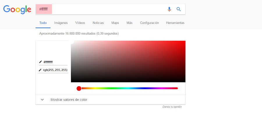 Entramos en el buscador Google y en el cuadro de búsqueda escribimos la referencia de cualquier color, nosotros escribiremos #ffffff, a continuación os aparecerá la herramienta de la que os hablo.