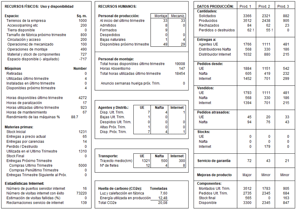 En la primera decisión se volcaron en dar un vuelco a la generación de demanda, con una importante inversión en publicidad a medio plazo y un incremento de la red comercial (dos decisiones que tardarán 1 trimestre en empezar a surtir efectos). Una subida de la I+D para obtener mejoras en los productos, que pasa de 55.000€ a 95.000€ en el trimestre.A nivel operativo y de recursos humanos una decisión de expansión como la tomada requiere tener la capacidad de producir para cubrir la previsible demanda, puede verse la contratación de 8 trabajadores, la subida de salarios para garantizar la atracción de talento, o la subcontratación de miles de unidades. Para hacer hueco a las nuevas contrataciones se decide ampliar la fábrica con toda la tierra disponible posible. También se toma la decisión de comprar materia prima con antelación para beneficiarse de los bajos precios a 3 meses.