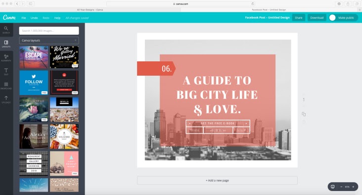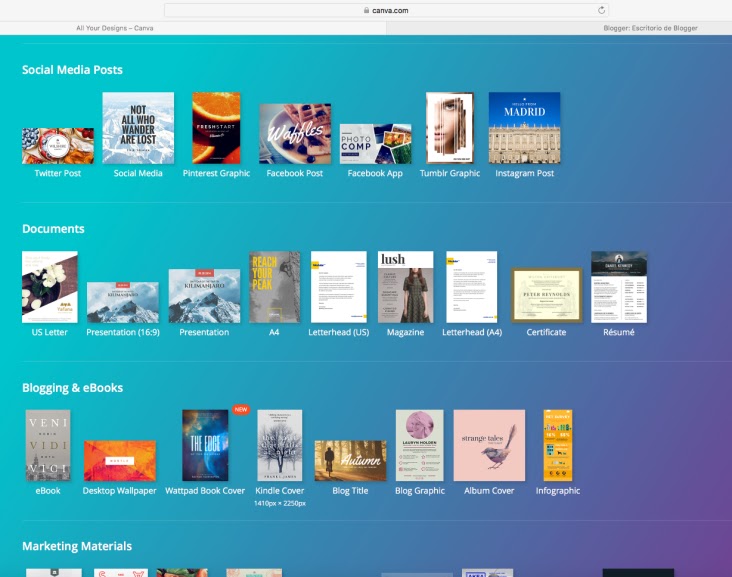 ¿QUÉ ES CANVA?Es una aplicación online de uso gratuito muy fácil de manejar y por la cual no es necesario descargar ningún software. En Canva podéis diseñar cualquier tipo de publicación que necesitéis ya que tiene predefinidas infinidad de plantillas adaptadas a las plataformas más utilizadas, desde publicaciones para redes sociales como Facebook, Twitter, Instagram, hasta presentaciones o portadas para crear un ebook, infografías, newsletters... Os podría dar una lista enorme, pero creo que lo mejor será que le echéis vosotros mismos un vistazo a todas las opciones aquí.