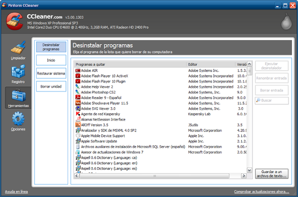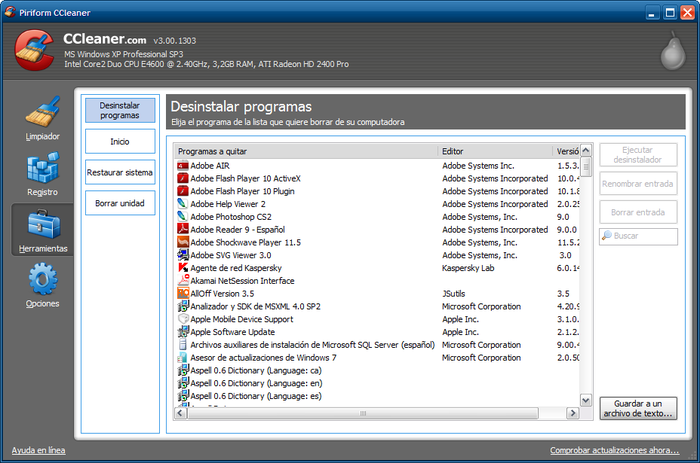 Ccleaner es una herramienta fiable y eficaz que limpia nuestro equipo de forma segura. Su función es eliminar archivos temporales del navegador, del sistema operativo, de otros programas que tengamos instalados y también ofrece la posibilidad de limpiar nuestro pc, pudiendo dar hasta 35 pasadas para que los archivos sean menos recuperables. Además podemos limpiar nuestro equipo cada vez que se inicie.