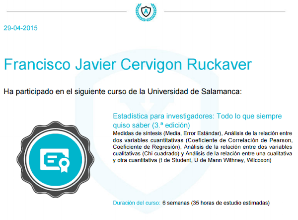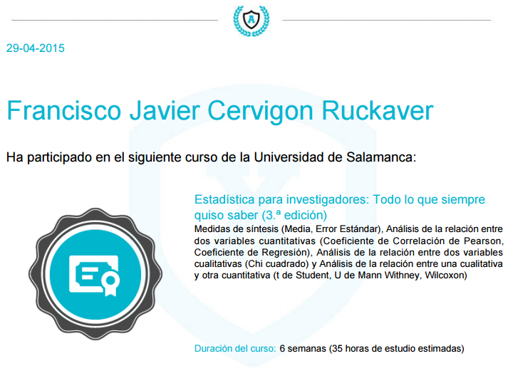 Certificado curso de la Universidad de Salamanca Estadística para investigadores (3.ª edición). Francisco Javier Cervigon Ruckaver