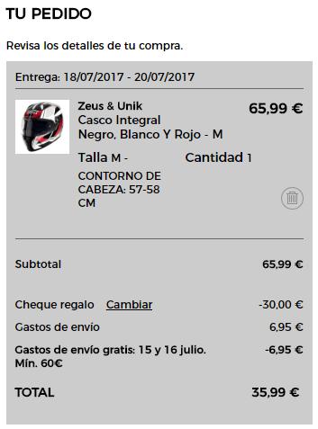 Las imágenes son fruto de una compra ficticia, aunque un casco nuevo por 36 no está nada mal. En mi caso compré un bote de crema solar + 5 camisetas por 28.