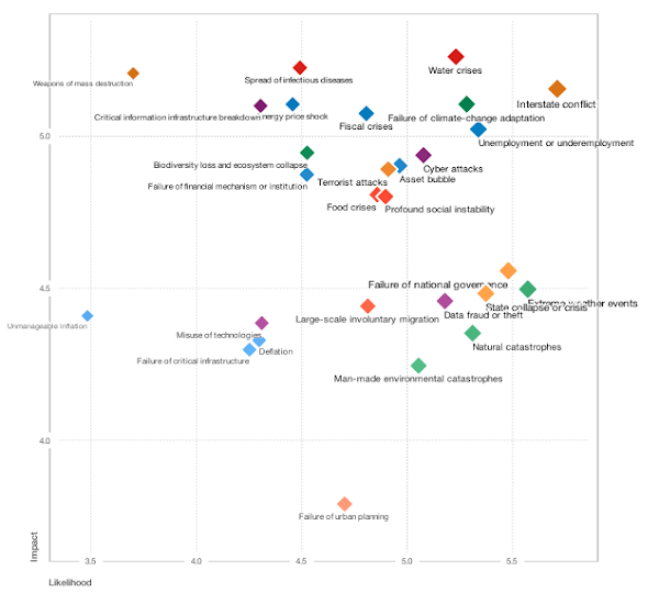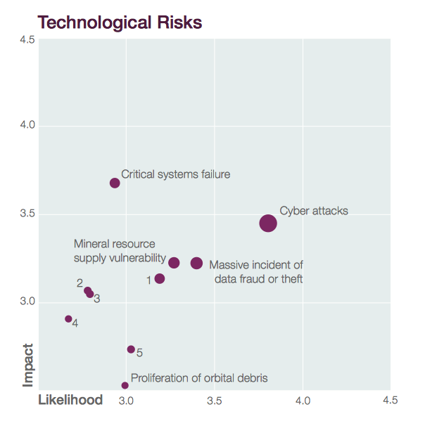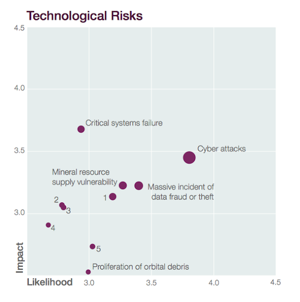 Como se aprecia, el impacto y probabilidad de los ciberataques se ha incrementado de forma sostenida. Pero igualmente es importante observar que los ciberataques están al nivel de crisis nacionales como crisis por el agua, conflictos entre estados, desempleo o subempleo, crisis fiscales o por las fallas en adaptarse al cambio climático. Ciberataque: análisis sistémico