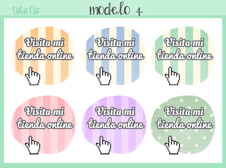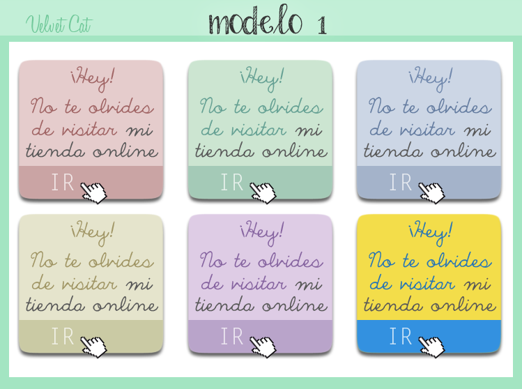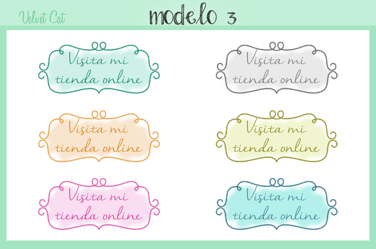 He diseñado cuatro modelos diferentes en varios colores que están pensados para ponerlos en la barra lateral del blog, ¡cuanto más arriba mejor! así nos aseguramos de que nadie deje de visitar nuestra tienda porque no sabe de su existencia.