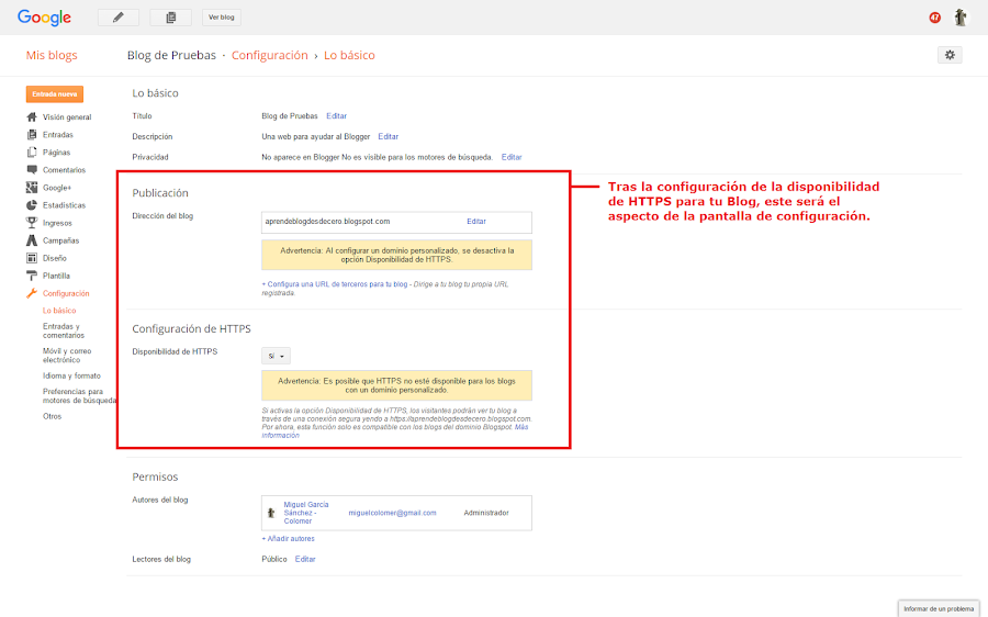 Recientemente se ha proporcionado la posibilidad de activar HTTPS como protocolo de comunicación para los dominios .blogspot de Blogger. Así pues, ya puedes utilizar HTTPS en tu propio blog de Blogger de una manera muy sencilla. Aprende paso a paso cómo activarlo en tu Blog y las consideraciones que deben tenerse en cuenta al respecto.