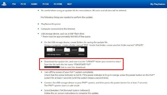Una vez que el USB esté formateado en FAT32, cree una carpeta en la raíz del USB llamada PS4. Dentro de la carpeta PS4 cree otra carpeta llamada UPDATE. Tenga en cuenta que tanto la carpeta PS4 como la de ACTUALIZACIÓN deben estar etiquetadas en todas las tapas. Finalmente, transfiera el sistema operativo de la Playstation a la carpeta UPDATE. A continuación, vuelva a conectar su PS4 e iníciela en modo seguro. Para ello, mantenga pulsado el botón de encendido durante unos 8 segundos. Seleccione Initialize PS4 (Reinstall System Software) y siéntese mientras hace su trabajo.