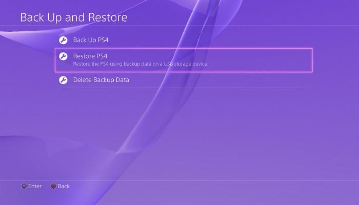Ahora que su PS4 está en funcionamiento, tendrá que restaurar todos sus datos. Si ha hecho una copia de seguridad de sus datos en un USB, conecte el USB y seleccione Sistema -> Copia de seguridad y restauración.Para restaurar sus datos desde la nube, diríjase a Configuración y seleccione Administración de datos guardados de la aplicación. Desde aquí, seleccione Datos guardados en el almacenamiento en línea. Por último, seleccione Descargar a almacenamiento del sistema y siga las instrucciones.