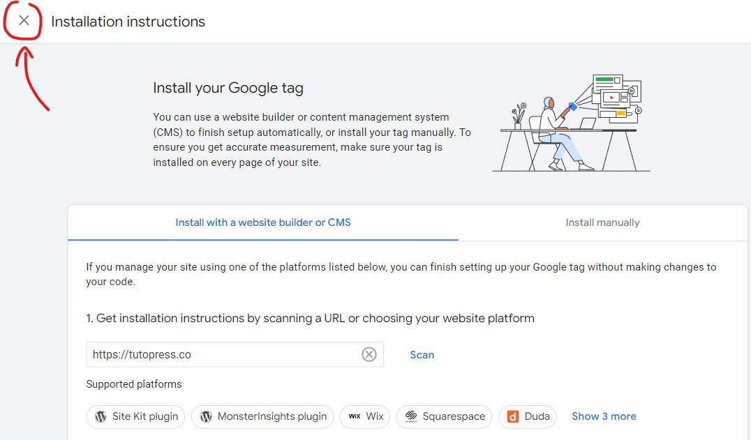 Se abrirá una nueva ventana que es un asistente para instalación de GA4, cierra esa ventana ya que lo que nos interesa es el ID de medición.