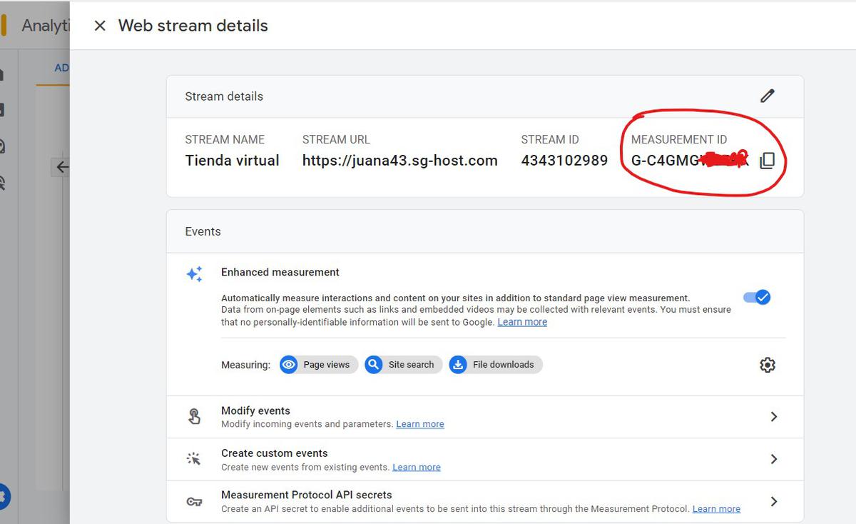 Aparecerá la ventana de configuración de la fuente de datos. Aquí lo único que debes hacer es copiar el ID de seguimiento de Google Analytics 4.