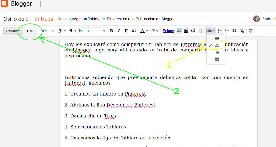 5. En la redacción de una entrada en Blogger, ubicamos el espacio donde posicionaremos nuestro Tablero, en ese espacio primeramente aplicamos el "centrado"(1) y luego hacemos clic en HTML(2)