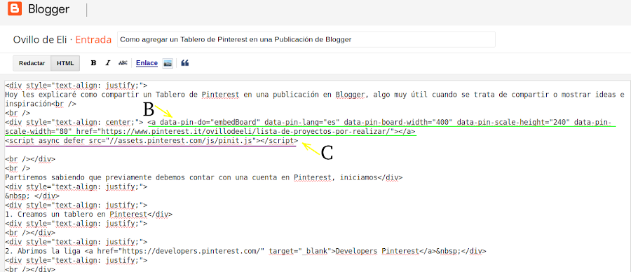 4. Colocamos el link del Tablero en donde dice URL del Tablero (en A), luego abajo observamos que se nos proporciona un código (B) y un pinit.js (C)
