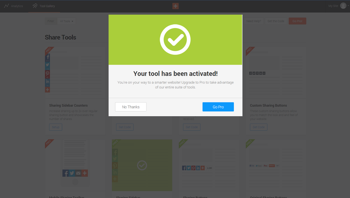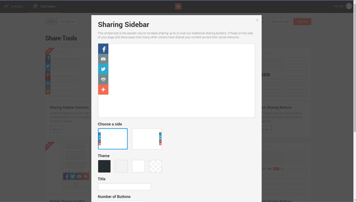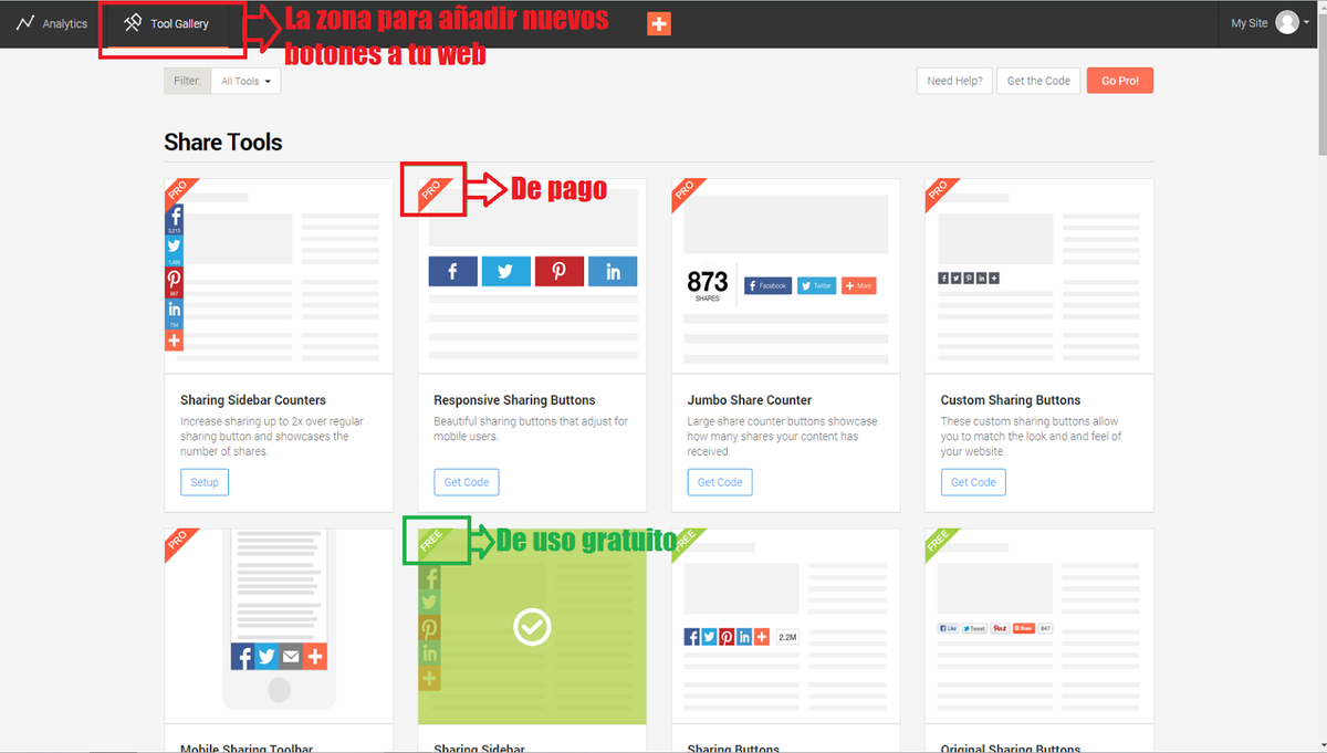 6) A partir de ahora y siempre que accedas a la herramienta, verás por defecto entrarás en "Analytics" donde podrás ver las estadísticas de uso de los botones que hayas incorporado a tu web. Lo importante es que el "Tool Galery" siempre podrás acceder y seleccionar los botones que prefieras añadir a tu web.