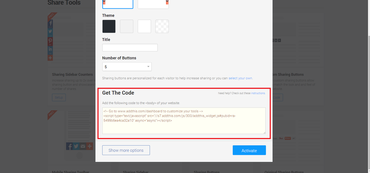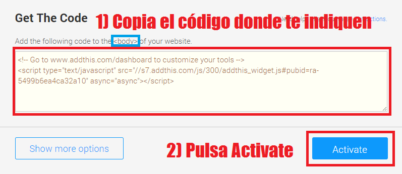 Después pulsa "Activate" para comenzar a verlo en marcha.9) Si tu web es Wordpress o una página web normal, simplemente pega el contenido de "GET THE CODE" en tu página y al pulsar "Activate" comenzarás a disfrutar de los botones para redes sociales.Para añadir en Blogger los botones para redes sociales de AddThis: