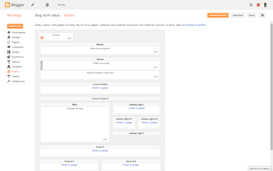 4) Llévate el código Javascript del paso 3 a tu Blog y colócalo donde quieras para que te aparezca el buscador personalizado. Dentro de Blogger, ve a la opción de menú "Diseño" y te aparecerá una pantalla como la que te muestro a continuación: